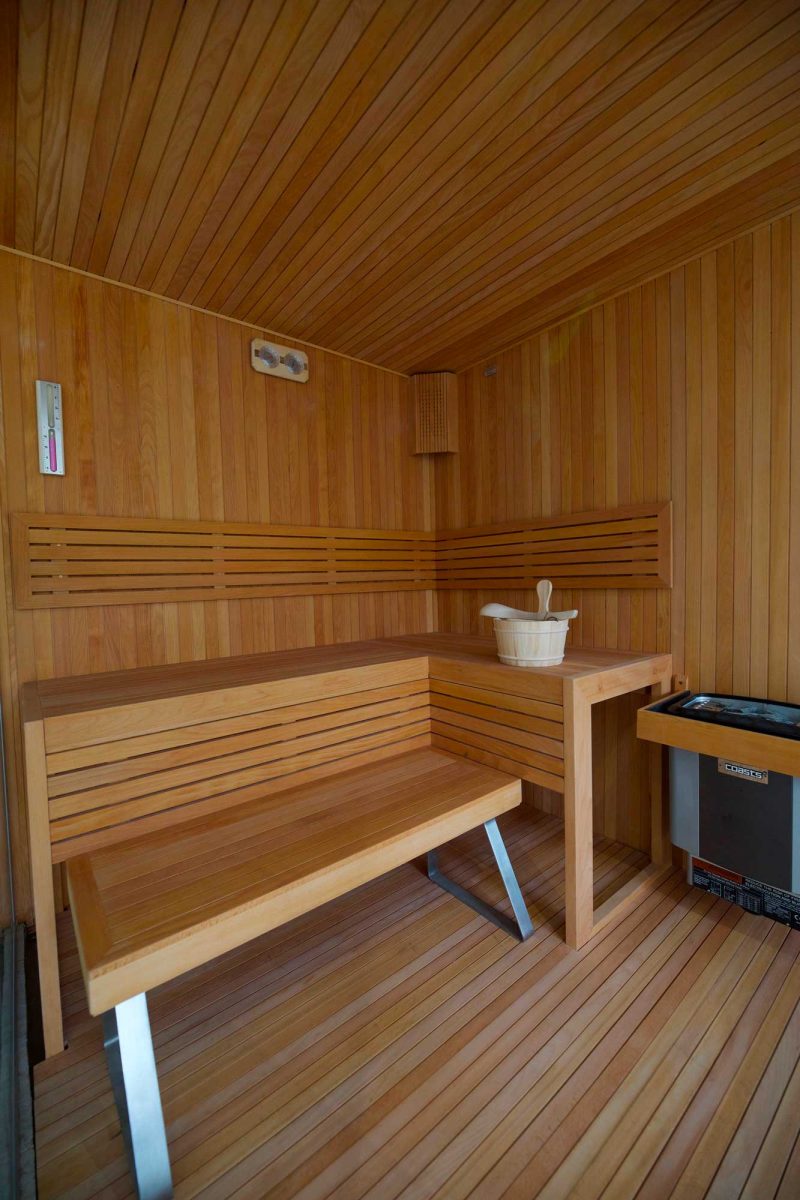Le sauna complète l'espace wellness avec une chaleur sèche contrastant avec l'humidité du bassin hydromassant. Les dimensions minimales atteignent deux mètres sur deux mètres pour quatre personnes. L'isolation thermique de quinze centimètres et le pare-vapeur aluminium s'installent durant la construction.